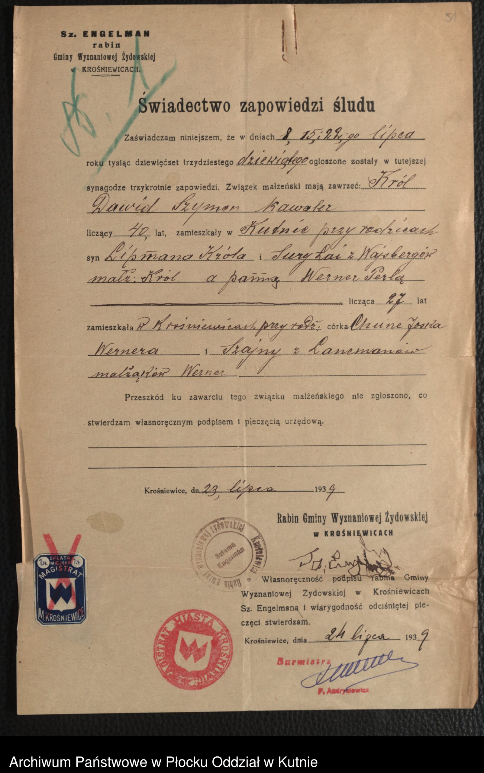 To jedne z ostatnich zapowiedzi przedślubnych – z lipca 1939 roku…