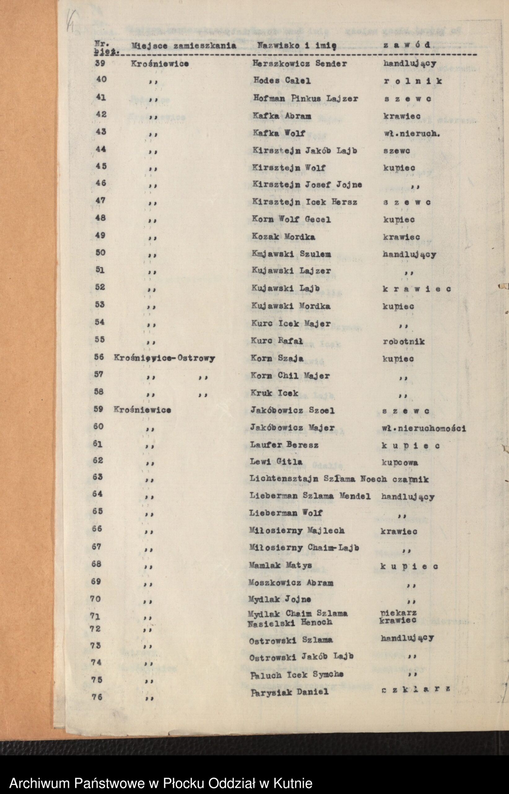 „Rozwadowski i jego pasierb Tajchman byli felczerami; Rosen, który miał kamienicę w rynku, przez jakiś czas posiadał janowicki folwark. W kamienicy Ch. Zajde prowadził skład żelaza, sprzedał ją rzeźnikowi Komorowskiemu – róg Rynku i Kutnowskiej. Engelman nabył na krótko Głaznów, który sprzedał K. Matlakowskiemu. Po północnej stronie Rynku dom od Józefa Bińkowskiego kupił Książek- gorzelany z Miłonic. W domu tym mieszkał Wajnstaft – lekarz. Sklep znajdujący się na parterze należał najpierw do Rosena, potem do W. Kirsztajna, który przeniósł ten sklep na ul. Kutnowską nr 2. Następny dom w kierunku wschodnim należał do Michała Bieńkowskiego, a później do Jasińskiego i Szuberta. W tym domu mieszkał i miał sklep z artykułami piśmienniczymi i galanterią Abram Warszawiak. Do spółki z Warszawiakiem sklep prowadził Icek Edberg. Wspólnie z żoną Bliną Treumanówną prowadzili sklep galanteryjny przy ul. Kutnowskiej 2 – dom w tym czasie należał do Grabińskiego, a sklep znajdował się od strony domu Piotrowskiego. Obok A. Warszawiaka sklep miał Ołomski, po którym przejął go krawiec Michalczyk. Na drugim piętrze tego domu mieszkał rzeźnik Żołna, z synem i córką Sarą. Sara wyszła za mąż za Lasmana, który dzierżawił w Krośniewicach kino, a ona prowadziła sklep kolonialno-spożywczy na rogu Rynku i ul. Ostrowskiej. W tym samym domu od ul. Toruńskiej mieszkał na I piętrze Mordka Kujawski – krawiec wraz z żoną, synem i córką Salą. Mieszkał tu również Michał Treuman, jego syn Srulek, córka Sala i drugi syn Abram. W domu Wernera, który prowadził skup zboża na posesji po zachodniej stronie ul. Ostrowskiej, mieszkał wraz z żoną kupiec zbożowy Bigelajzen. Jego syn, który był działaczem komunistycznym, zmarł w ZSRR. Także u Wernera mieszkał Lewin, którego ojciec skupował „szmelc”. On pierwszy kupił w Krośniewicach samochód. Jego córka Sura wyszła za mąż za Chodessa, który prowadził gospodarstwo na Bardzinku. Chodess mieszkał z rodziną przy ul. Kutnowskie nr 2. Druga córka Lewina wyszła za Hajnego Apla. Dom Wernera miał ganeczek i sad owocowy. W kierunku północnym za domem Wernera, w budynku stojącym również po zachodniej stronie, mieszkał rabin, wyższy stopniem od tego, który mieszkał przy synagodze przy ul. Kutnowskiej. Był on cadykiem. Po wschodniej stronie ul. Ostrowskiej był Bank Żydowski, którego założycielem i kierownikiem był Rosen. Bank kupił sąsiednią posesję od Piotrowskiego, który nabył ją wcześniej od wdowy po Aplu, która prowadziła tam magiel. Dalej wzdłuż drogi do Kajewa stały, dziś już nieistniejące, dworki otoczone sadami, w których mieszkali wyżsi urzędnicy majątku Błonie. Na końcu znajdowała się zachowana do dziś, siedziba administratora dóbr.