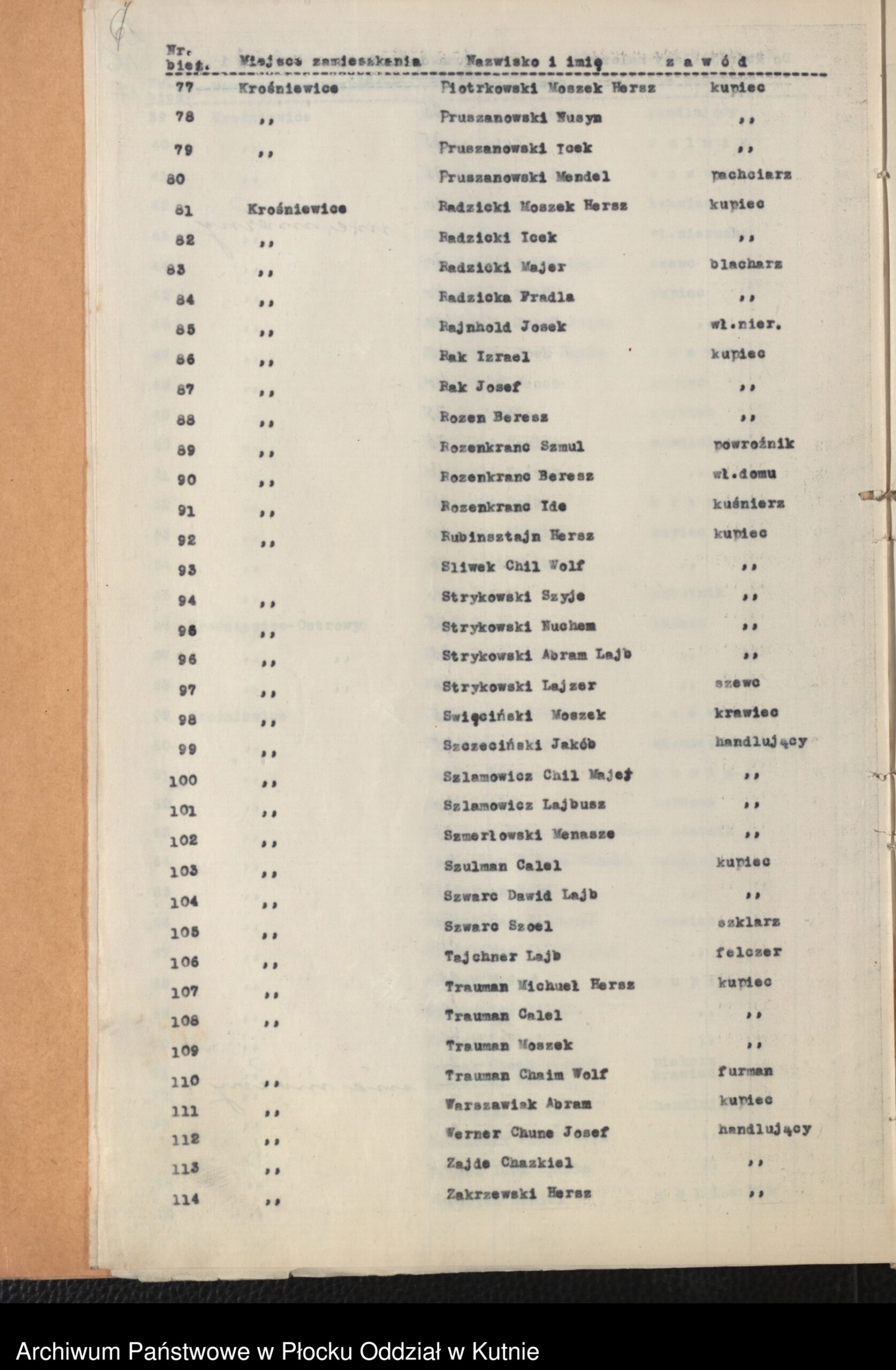 ul.Kutnowska (strona północna): Aleksander, Zakrzewski, Apel, Pruszanowski, Komorowski, Kaszubska, Kaszub, Kaufman, Blank, Brzustowski, Troman, Szwarc, Blumenson, Strykowski, Lubraniecki, Zalcstejn, Fasenfest, Krauze, Kawka, Michalski, Lissak, Stejn, Ertman, Skowrońska, Liberman, Gelbartowicz, Gostyński, Dizner, po Plijence, Jagiełło, Troman, Podrzycki, Dzierzbicki, Grabiński, Kahał, Bresler, Glanc, Radzicka, Rozenkranc, Strykowski, Blumenfeld, Rak, Goldman, Kozak, Troman, Bocian.