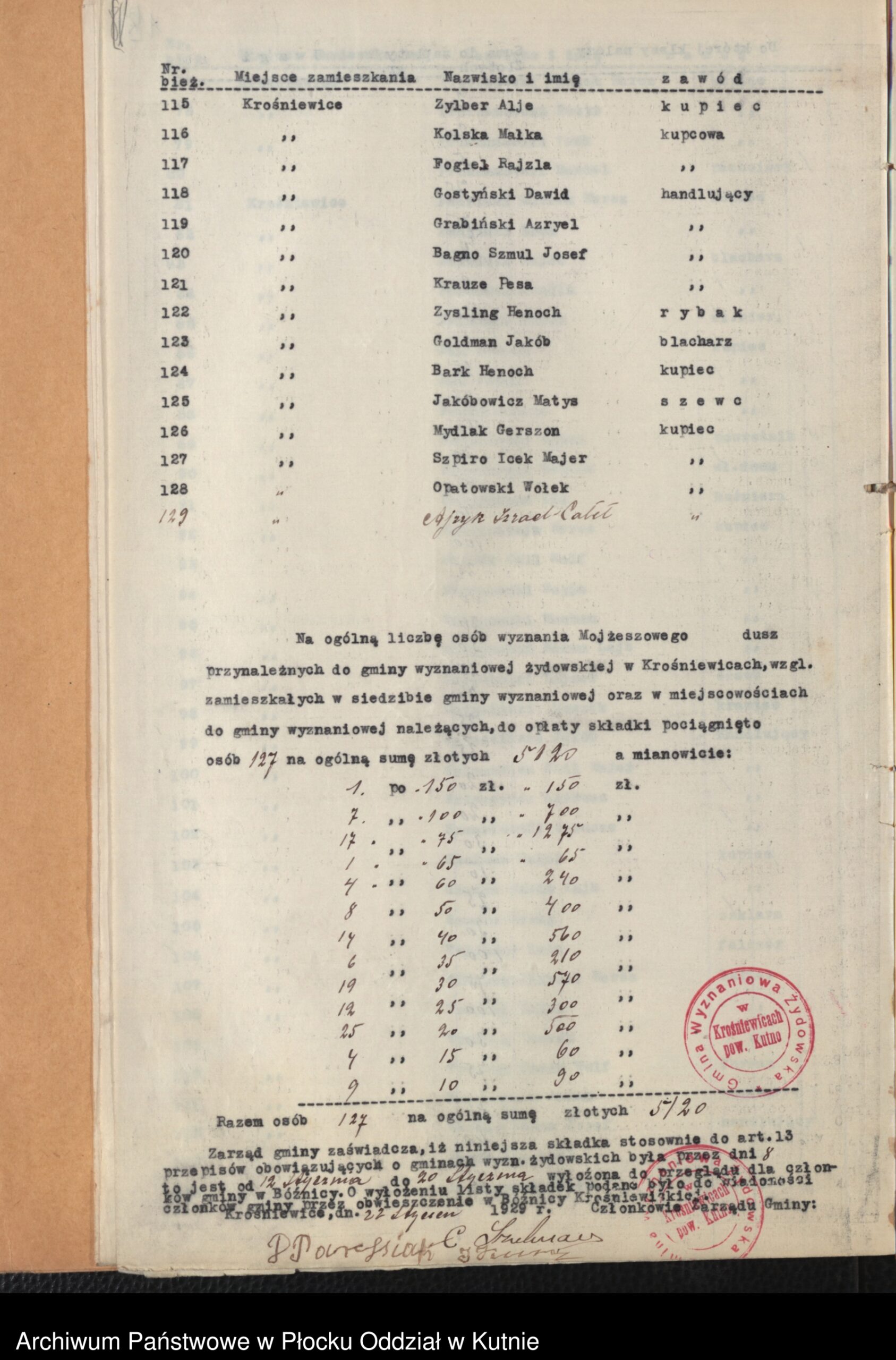 Wykaz członków Gminy Wyznaniowej Żydowskiej w Krośniewicach płacących składki w 1929 roku.